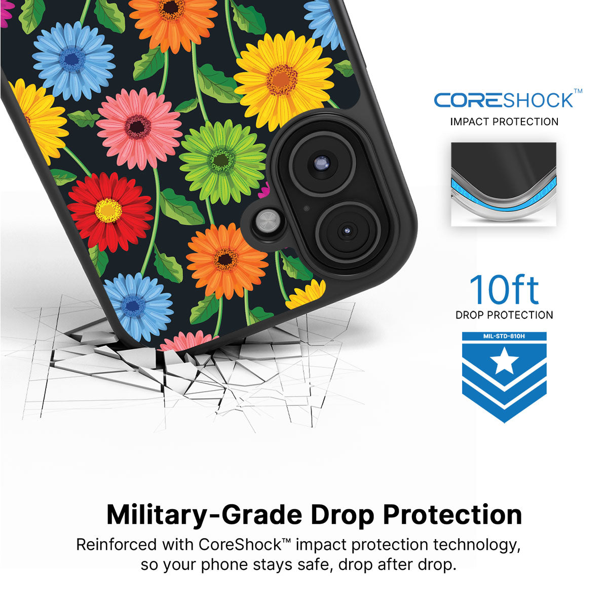 Our CoreShock™ system is engineered for real-world drops, delivering up to 10feet of impact protection without bulk. Built for durability and everyday confidence, it helps absorb and disperse shock, so your phone stays safe when life slips.