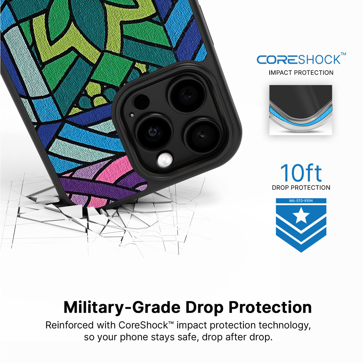 Our CoreShock™ system is engineered for real-world drops, delivering up to 10feet of impact protection without bulk. Built for durability and everyday confidence, it helps absorb and disperse shock, so your phone stays safe when life slips.