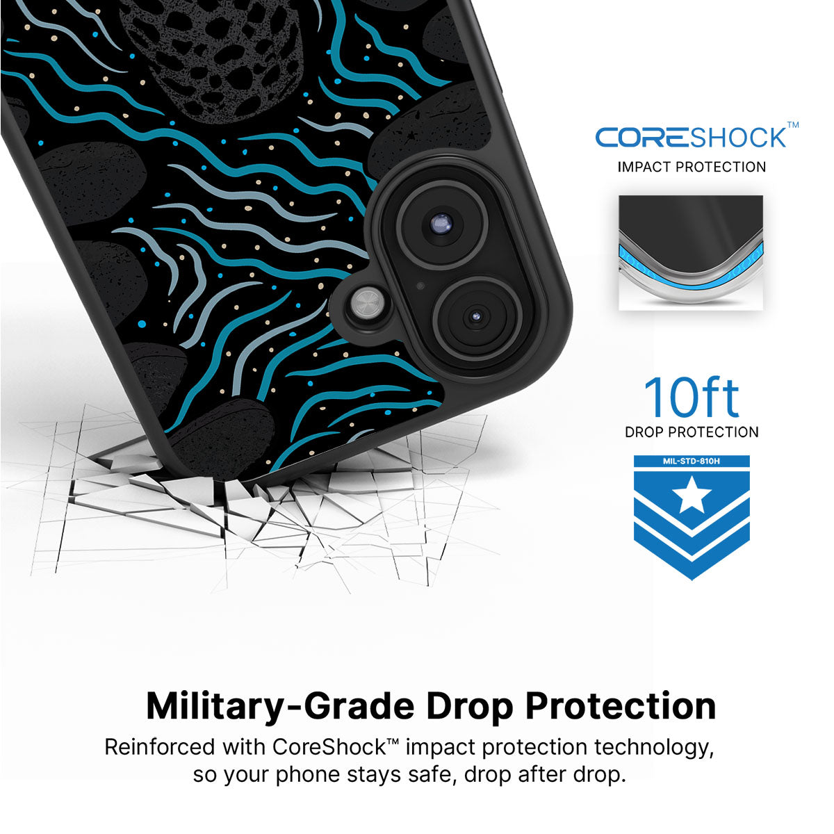 Our CoreShock™ system is engineered for real-world drops, delivering up to 10feet of impact protection without bulk. Built for durability and everyday confidence, it helps absorb and disperse shock, so your phone stays safe when life slips.